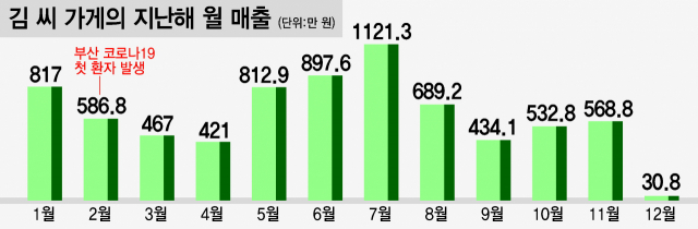 2019년 12월 김 씨의 식당 월 매출액은 942만 원이었으나, 코로나19 이후에는 수입이 줄어들기 시작했다. 특히 감염병 확산 방지를 위해 오후 9시 이후 영업이 금지된 지난 12월에는 고작 30만 원으로 수직 하락하고 말았다. 이는 전년도 같은 달 매출의 3%에 불과해 김 씨는 실로 넋이 나가는 기분이었다. 지난해 10월부터는 대출 이자도 밀렸다. 결국 코로나19에 따른 피해로 그의 신용 등급은 10등급으로 떨어졌고, 연체자 신세가 되고 말았다.