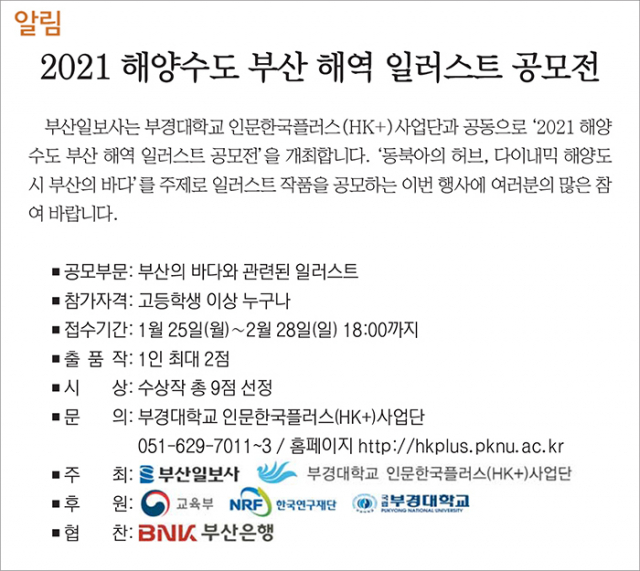 부산일보사는 부경대학교 인문한국플러스(HK+)사업단과 공동으로 ‘2021 해양수도 부산 해역 일러스트 공모전’을 개최합니다. ‘동북아의 허브, 다이내믹 해양도시 부산의 바다’를 주제로 일러스트 작품을 공모하는 이번 행사에 여러분의 많은 참여 바랍니다.