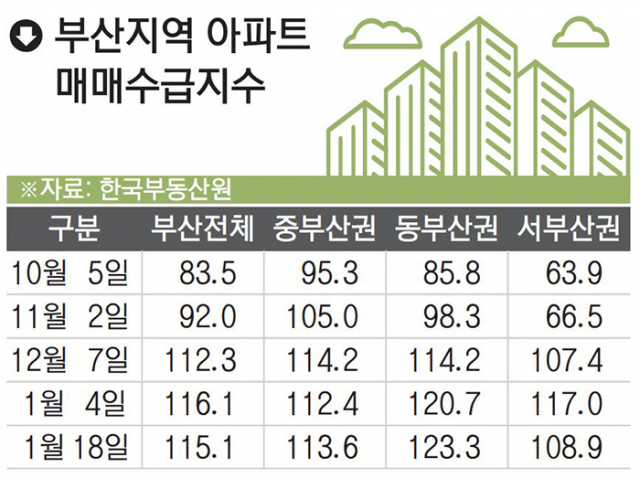 25일 한국부동산원의 주간 아파트 통계자료에 따르면 1월 3주(18일 기준) 부산 아파트 매매수급 지수는 115.1로 지난해 12월 최고점(116.1)보다 불과 1포인트 하락한 수준이었다. 1월 들어 주간 부산 아파트 매매가격 상승률이 많이 떨어졌음에도 불구하고 여전히 아파트를 사려는 매수심리가 높은 것이다.