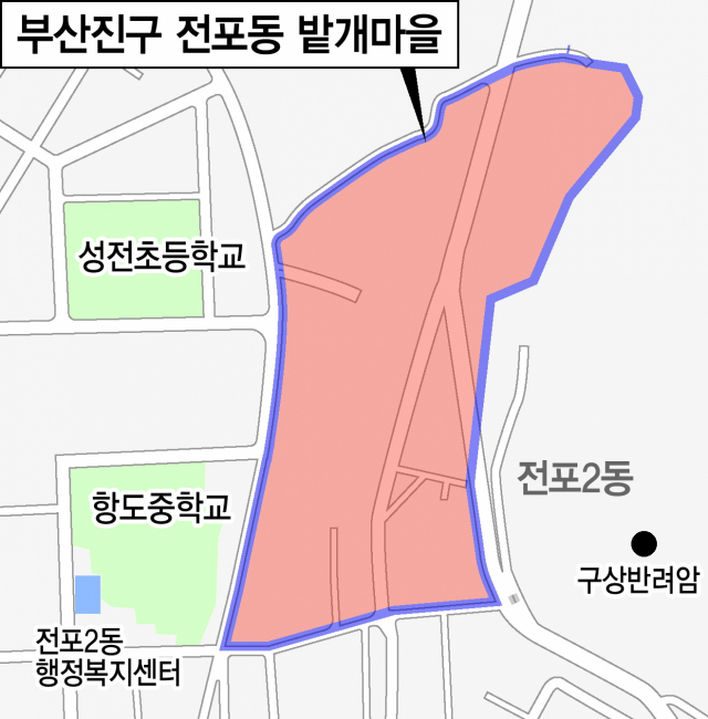 25일 부산진구청에 따르면 주거환경개선지구로 지정된 부산진구 전포2동 ‘밭개마을’에 재개발 추진준비위원회가 구성되고 있다. 국가 공모 사업에 선정돼 국비 투입이 확정된 마을에서 재개발 붐이 일고 있는 것이다. 구청은 동향보고서를 작성하며 재개발 추진 상황을 예의주시한다. 5만 8600㎡에 달하는 밭개마을에는 897가구, 1700여 명이 산다.