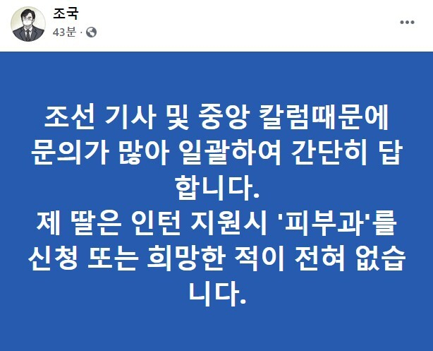 조국 전 법무부 장관이 딸 조민 씨가 지원한 보건복지부 산하 국립중앙의료원(NMC) 인턴을 둘러싼 의혹에 대해 "제 딸은 인턴 지원시 '피부과'를 신청 또는 희망한 적이 전혀 없다"고 밝혔다.
