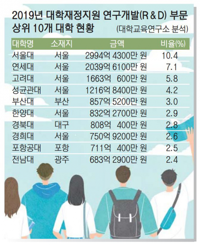 상위 10개 대학 중 포항공대를 제외한 비수도권 대학은 부산대와 경북대, 전남대 단 3곳에 뿐이다. 이들 3개 비수도권 대학이 차지하는 연구개발 재정 또한 겨우 10.4% 수준에 불과하다.