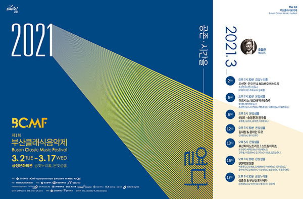 부산 금정구(구청장 정미영) 금정문화회관이 부산클래식음악제조직위원회, 부산일보사, 부산MBC, 부산CBS와 공동 주최하는 <부산클래식음악제>(예술감독 오충근, 이하 BCMF음악제)가 2021년 3월 2일부터 17일까지 금정문화회관 금빛누리홀(880석), 은빛샘홀(394석)에서 개최된다.
