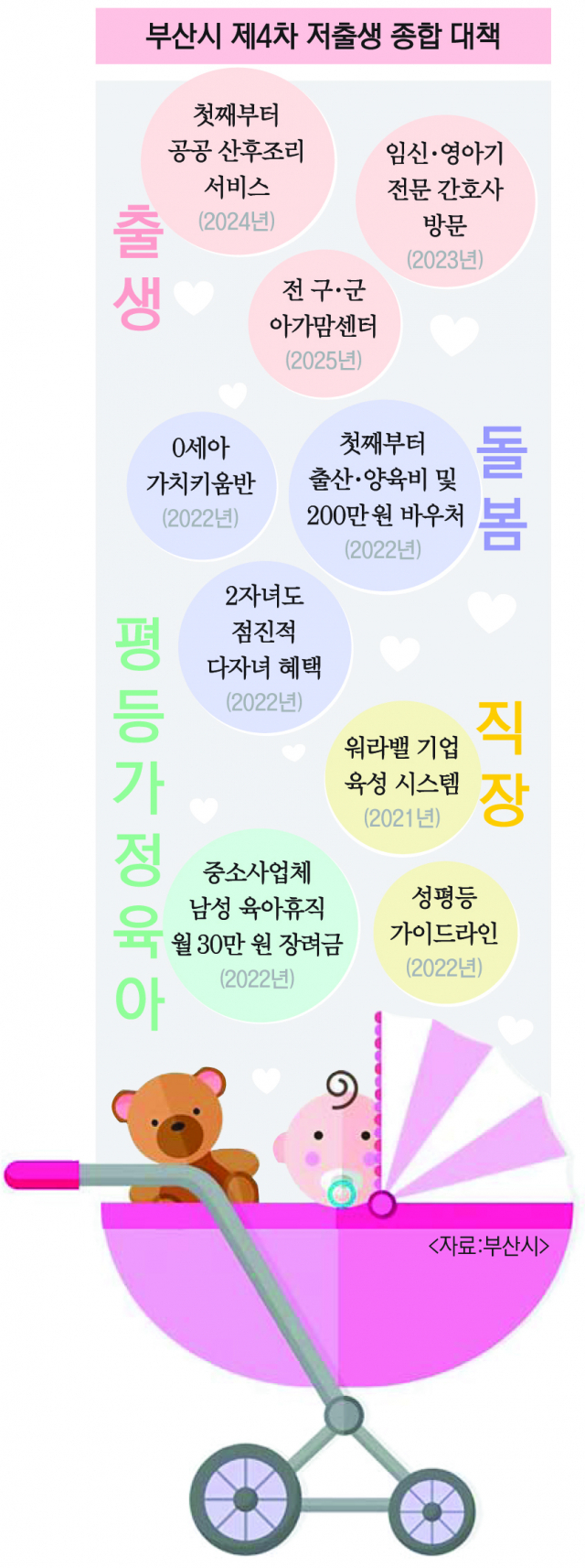 출산과 관련해서는 공공 산후조리 서비스가 2024년까지 모든 대상으로 확대된다. 산모와 신생아의 건강 관리를 위한 이 서비스는 현재 둘째부터 지원되고 있다. 또 2023년까지 부산 연제구 등 일부 지역에서 시범 운영하던 임신·영아기 전문 간호사 방문 관리 지원이 부산 전역으로 확대된다. 임신·출산 원스톱 ‘아가 맘 센터’도 2025년까지 전 구·군에 설치된다. 난임 지원 바우처와 한방 난임 지원 등의 난임 부부 종합 지원도 별도로 이뤄진다.