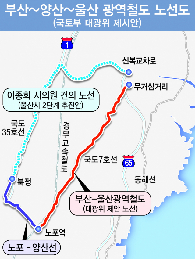 이 의원은 “양산시와 울산시가 지난해 국토부에 부산 노포동~양산 웅상~울산 무거동을 잇는 노선(총연장 33.6km)과 울산~KTX 울산역~양산 북정역 노선(총연장 40.4km)을 각각 신청했다”며 “하지만 대도시권광역교통위원회(이하 대광위)가 2개 노선의 절충노선(부산 노포동~양산 웅상~울산 무거동~KTX 울산역(총연장 51.5km)을 제안했고, 양산과 울산이 이를 수용했다”고 덧붙였다.