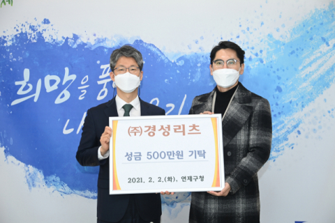 ㈜경성리츠(대표 채창일)은 2일 연제구청장실에서 저소득층 주민을 지원하기 위해 성금(500만 원)을 이성문 연제구청장에게 전달했다.