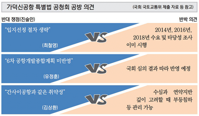 핵심 문제 제기는 가덕신공항에 입지 선정 절차 간소화에 대한 반발이다. 최철영 교수는 “일반적 공항건설절차를 모두 생략하고 2030 부산세계박람회의 성공개최를 위한 조기건설을 입법배경으로 하는 예외적이며 비정형적인 긴급특별법”이라며 “국회 입법권을 남용한 입법안”이어서 법안 제정에 반대한다고 했다. 유정훈 교수는 “최소한 공항시설법에 따라 5년마다 수립하는 공항개발종합계획에 먼저 반영하는 절차가 반드시 필요하다”며 “2016년 이후 지난 5년간 항공수요, 사회경제적 환경, 총 사업비 등에서 어떠한 상황 변화가 있었는지 면밀한 검토가 필요하다”는 의견이다.