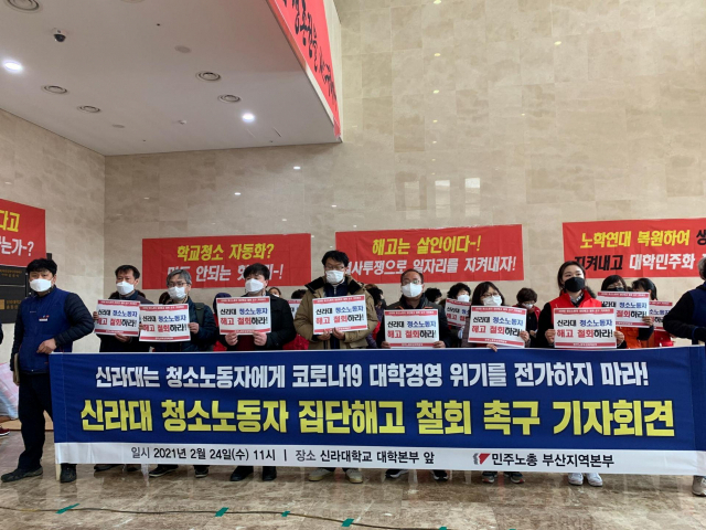 민주노총 부산본부는 24일 사상구 신라대 대학본부 앞에서 기자회견을 열고 “신라대는 코로나19시기 대학경영 위기를 학교에서 가장 취약한 최저임금의 비정규직 간접고용노동자에게 책임을 전가하지 말고 즉각 해고를 철회하라”고 주장했다.