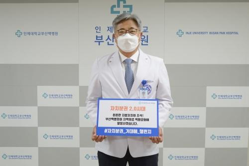 인제대 부산백병원 이연재 원장이 지난달 25일 자치분권 2.0시대를 응원하며 ‘지역의료 역량 강화에 앞장서겠다’는 손팻말을 들고 ‘자치분권 기대해 챌린지’에 동참했다.