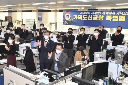 지난달 26일 오후 가덕신공항 특별법이 국회 문턱을 넘어서자 부산시와 상공계, 시민단체 등이 즉각 환영의 뜻을 밝혔다. 왼쪽부터 이병진 부산시장 권한대행과 신공항추진본부 직원들, 부산 상공인과 시민단체 대표들, 가덕도신공항유치국민행동본부 회원들이 법안이 통과되자 환호하는 모습. 부산시 제공 김경현 기자 view@ 이재찬 기자 chan@부산·울산·경남 800만 시·도민의 20년 염원인 가덕신공항 특별법이 지난달 26일 마침내 국회 문턱을 통과하자 부산시와 울산시, 경남도는 즉각 환영의 뜻을 밝혔다.