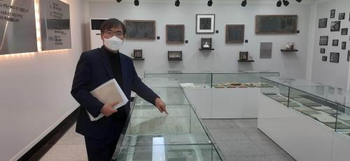 김해시 신어초등학교 정문 건너편에 자리 잡은 고석규비평문학관. 남송우 문학평론가가 전시물을 소개하고 있다.고석규비평문학관이 경남 김해시에 들어섰다. 최근 둘러본 이 문학관은 개관 준비가 이미 끝났다. 코로나19 상황 속에서 개관 날짜만 기다리는 상황이다. 위치는 신어초등학교 정문 건너편에 있는 6층 건물 은석문화회관(김해시 활천로 294) 맨 아래층이다. 지하 1층인데 평지로 접근이 가능한 구조다. 고석규비평문학관을 추진한 이는 문학평론가인 남송우 전 부산문화재단 대표이자 부경대 명예교수다. 그는 “고석규의 기일이 4월 19일인데 그 전에 개관할 계획”이라고 밝혔다.