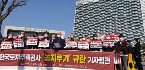 한국토지주택공사(LH) 일부 직원의 신도시 땅 투기 의혹에 대해 전국농민회총연맹 부산경남연맹 소속 농민들이 8일 경남 진주시 LH 본사 앞에서 기자회견을 열어 ‘농지법을 전면 개정해 농지 투기를 원천 차단해야 한다’고 촉구했다. 이선규 기자 sunq17@문재인 대통령은 8일 한국토지주택공사(LH) 투기 의혹과 관련, “국가가 가진 모든 행정력, 모든 수사력을 총동원해야 한다”면서 “국민을 실망시키는 일이 없도록 하라”고 강조했다.