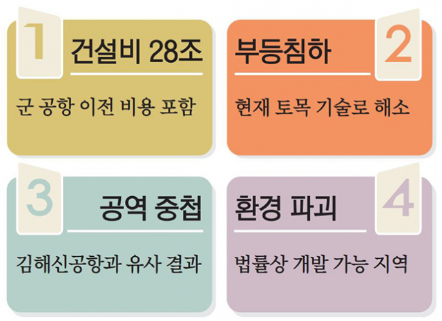 전문가들은 크게 볼 때 가덕신공항을 둘러싼 4가지 오해가 있다고 분석했다. 먼저 ‘건설비 28조 원’에 대한 오해를 꼽을 수 있다. 국토부는 가덕도 활주로 1본 건설에 12조 8000억 원, 2본 건설에 15조 8000억 원, 군 공항 이전까지 추진할 경우 28조 6000억 원이 든다고 문서에 명시했다. 전문가들은 이에 지난 10여 년 간 군 공항 이전은 단 한 번도 검토된 적이 없다고 못 박았다. 설사 군사공항을 이전한다고 해도 기부 대 양여 방식에 따라 기존 부지를 개발해 매각할 수 있다. 여기서 막대한 수익이 발생하는데, 국토부는 이를 숨긴 채 비용만 부풀려 제시했다는 것이다.
