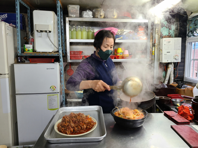 부대찌개와 두루치기를 준비 중인 장 사장님. 7000원짜리 두루치기의 양이 저렇게 푸짐하다. 서유리 기자