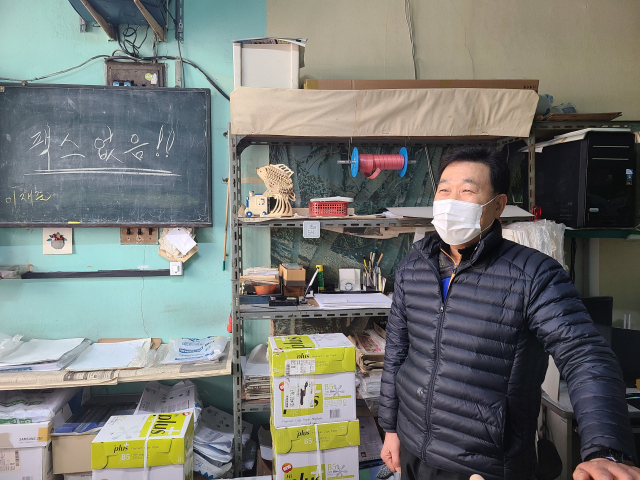 눈웃음이 매력적인 박 사장님. 오랜 세월을 견뎌낸 것 같은 칠판이 복삿집에 '팩스가 없다'는 사실을 알리고 있다.