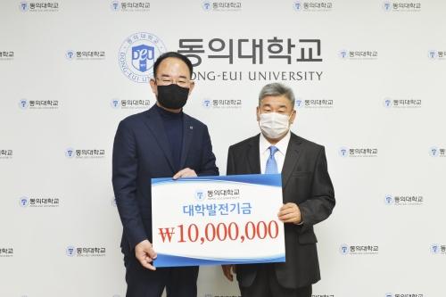 동의대학교(총장 한수환)에서 33년간 근무하고 최근 정년퇴직한 이희준(오른쪽) 씨가 지난 12일 동의대를 방문해 대학발전기금 1000만 원을 전달했다. 이 씨는 동의대 무역학과 79학번으로 1988년부터 33년간 모교에 재직하면서 국제언어교육원 행정실장 등을 역임했으며 제3, 4대 직원협의회장을 지냈다. 이재희 기자