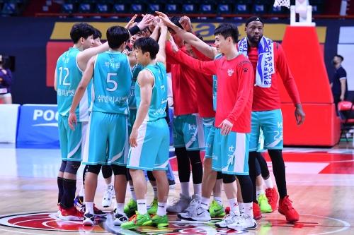 부산 KT 소닉붐 선수들이 13일 부산 사직체육관에서 열린 안양 KGC 인삼공사와의 프로농구 홈경기를 이긴 후 모여 승리를 자축하고 있다. KBL 제공부산 kt 소닉붐이 주말 이어진 경기에서 공동 4위로 올라섰지만 꼴찌에게 무릎을 꿇는 수모를 당했다.