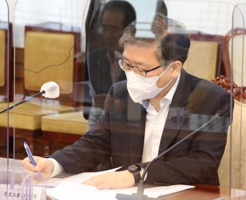 변창흠 국토교통부 장관이 14일 정부서울청사에서 열린 LH 후속조치 관계장관회의에서 정세균 총리의 발언을 메모하고 있다. 연합뉴스“바보야, 문제는 땅이야.”