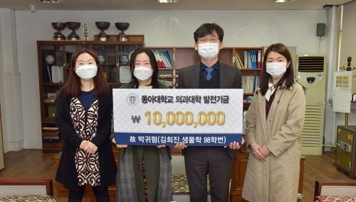 동아대학교 동문 자매 김희진·미정 씨는 최근 모친 고 박귀렴 씨 명의로 동아대학교(총장 이해우)에 의과대학 발전기금 1000만 원을 기부했다.