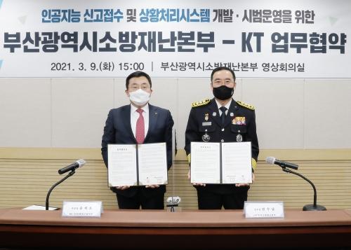 부산소방재난본부(본부장 변수남)는 최근 부산소방재난본부 3층 영상회의실에서 인공지능 119 신고 접수 및 상황처리시스템 개발·시범운영을 위해 KT와 업무협약을 체결했다. 이날 협약식은 변수남(오른쪽) 소방재난본부장과 송재호 KT AI/DX 융합사업부문장이 참석했다. 임원철 선임기자