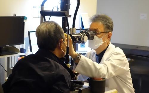부산성모안과병원 윤희성 병원장이 안구 검사를 시행하고 있다. 부산성모안과병원 제공건강보험심사평가원 자료에 따르면 2017~2019년 3년간 국내 황반변성 환자가 16만 4818명에서 20만 471명으로 약 20% 증가했다. 연령별로는 61~80세 사이에 가장 많이 분포돼 있고, 70대 이상 고령층에선 5명 중 1명꼴로 황반변성에 시달린다.