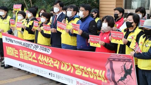 마트노조 홈플러스지부가 15일 오전 부산시 부산진구 홈플러스 가야점 앞에서 대주주이자 사모펀드인 MBK의 가야점 폐점매각과 관련해 규탄 기자회견을 하고 있다. 강선배 기자 ksun@