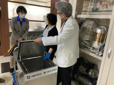 대동대학교(총장 배순철)는 지난 3월 4일(목), 금정구 부곡동에 위치한 지역사회 병원 중 하나인 사랑요양병원에 재학생들의 취창업경진대회 아이디어로 개발한 의료폐기물 용기 및 운반카트의 시제품을 전달하고 그에 따른 제품품평회를 진행하였다.