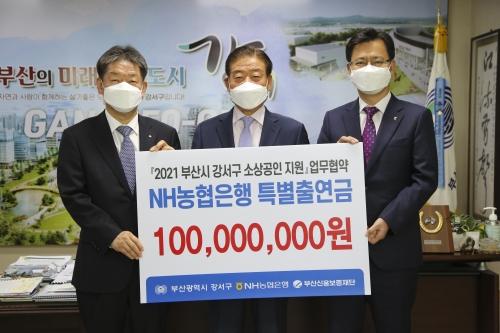 NH농협은행 부산영업본부(본부장 최명호·오른쪽)는 지난 17일 부산시 강서구청(구청장 노기태·가운데), 부산신용보증재단(이사장 김승모)과 강서구청에서 ‘2021 부산시 강서구 소상공인 지원’에 대한 업무협약을 체결했다.