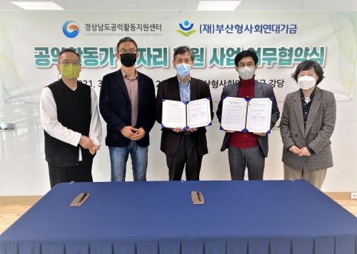 (재)부산형사회연대기금(이사장 전장화·가운데)은 지난 16일 경상남도 공익활동지원센터(센터장 이종은·왼쪽 네 번째)와 업무협약을 체결하고 2021년 부산 지역 6개, 김해·양산지역 4개 단체를 추가로 선정해 공익활동가 일자리 사업비로 4억 원을 지원키로 했다.
