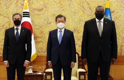 문재인 대통령이 18일 오후 청와대에서 미국의 토니 블링컨(왼쪽) 국무장관과 로이드 오스틴 국방장관 접견에 앞서 기념촬영을 하고 있다. 연합뉴스