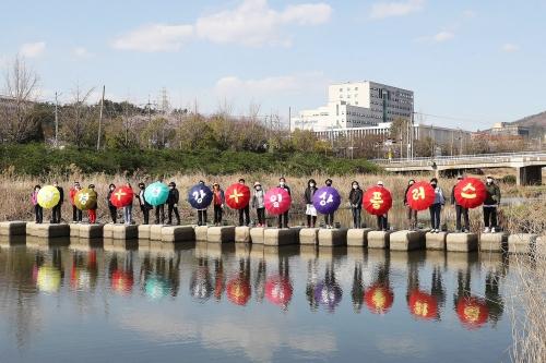 세계 물의 날‘인 22일 경남 창원시가 창원천을 달리면서 쓰레기를 줍는 플로깅(plogging) 행사를 했다. 허성무 창원시장 등 참석자들이 부대행사로 창원천 돌다리에서 ’환경 플러스·건강 플러스·일상 플러스‘가 적힌 우산 퍼포먼스을 하고 있다. 창원시 제공