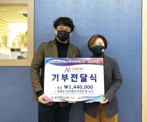 동아대학교 산업디자인학과 김재홍 교수와 학생들은 최근 ‘디자인 재능기부’ 활동으로 모은 수익금을 비영리 민간단체(NPO) 이지투게더(소장 안미경)에 전달했다.