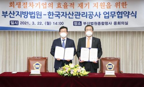 캠코(한국자산관리공사, 사장 문성유·오른쪽)는 지난 22일 부산지방법원 종합청사에서 부산지방법원(법원장 전상훈)과 ‘회생 기업의 효율적 재기 지원을 위한 업무 협약’을 체결했다. 문성유 캠코 사장은 “앞으로도 캠코는 법원과 적극 협력해 회생 기업의 성공적 재기 사례를 지속적으로 만들어 경제 활력 제고에 기여해 갈 것”이라고 말했다. 임원철 선임기자