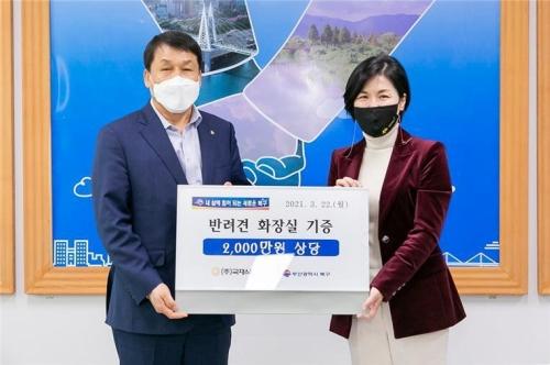 부산 북구청(구청장 정명희)은 지난 22일 (주)국제식품(회장 정창교·왼쪽)이 2000만 원 상당의 ‘반려견 화장실’을 기증했다고 밝혔다.