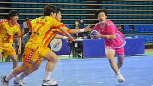 부산일보사 주최로 경남 고성에서 열리고 있는 ‘2021 대한핸드볼협회장배 전국 중·고등선수권대회’ 이틀째 경기에서 경남체고 정아린이 일신여고 김단비 등의 수비를 피해 공격을 시도하고 있다.부산일보사와 대한핸드볼협회가 주최하는 ‘2021 대한핸드볼협회장배 전국 중·고등선수권대회’가 대회 이틀째를 맞으며 열전을 이어가고 있다.