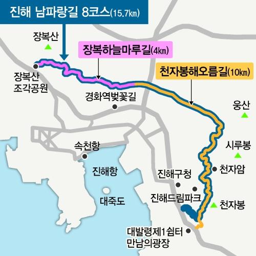 창원 구간은 6~11코스로, 8코스는 진해구 상리마을 입구에서 진해드림로드 입구 구간이다. 진해드림로드 4개 코스(27.4km) 가운데 창원시의 추천 구간인 1코스 장복하늘마루길(4km) 전체와 2코스 천자봉해오름길(10km)의 대부분이 포함된다. 진행 방향은 남파랑길 8코스의 역방향, 진해드림로드 입구에서 시작해 상리마을 입구로 나오는 걸 잡았다.