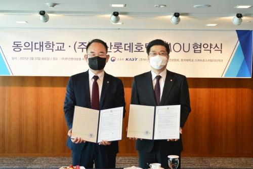 동의대(총장 한수환·왼쪽)는 지난 23일 부산롯데호텔 41층 아테네룸에서 부산롯데호텔(대표이사 서정곤)과 양해각서(MOU)를 체결했다. 이날 행사에는 부산롯데호텔 서정곤 대표이사와 동의대 한수환 총장 등이 참석했다. 이 협약을 통해 부산롯데호텔은 동의대가 수행하고 있는 교육부 ‘조기취업형 계약학과 선도대학 육성 사업’의 스마트호스피탈리티학과와의 협업을 통해 사업의 성공적인 운영을 지원하기로 했다. 임원철 선임기자