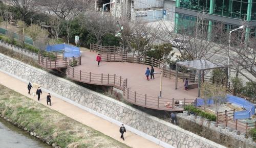 부산 사상구 학장천 제방에 ‘미래 100년 사상 전망데크’가 설치돼 눈길을 끌고 있다. 약 100여 평 규모의 이 친수공간은 태양광 조명등도 설치해 야간 경관도 조망할 수 있다. 강선배 기자 ksun@
