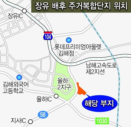 경남경찰청이 이 의혹과 관련해 지역 금융기관과 기획부동산 등에 대한 압수수색을 벌여 불법 여부를 살펴보고 있는 사업장은 김해시도시개발공사가 시행사로 참여 중인 ‘장유 배후 주거복합단지’(현장 사진)다.