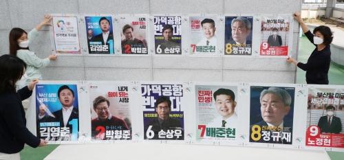 4·7 부산시장 보궐선거 공식 선거운동을 하루 앞둔 24일 오후 부산 수영구선거관리위원회에서 직원들이 각 후보가 제출한 선거벽보를 외벽에 시험 부착해 보고 있다. 선거벽보는 유권자의 통행이 많은 곳의 건물 외벽 등 부산 시내 3615군데에 부착될 예정이다. 강선배 기자 ksun@4·7 부산시장 보궐선거의 공식 선거운동이 25일 시작되면서 여야가 13일간의 총력전에 들어갔다. ▶관련 기사 3면