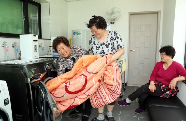 2018년 5월 부산 서구 아미동 비석마을 '골목빨래방'이 생겼을 당시 율이 만난 통장님. 제일 왼쪽에서 빨래를 꺼내고 있는 사람이 윤지선 통장님이다. 부산일보 DB