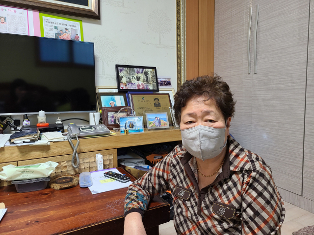 부산 서구 아미동 비석문화마을 16통 통장을 맡고 있는 윤지선 통장님. TV 뒤쪽 연두색 종이에 율이 쓴 기사가 붙여져 있다. 서유리 기자