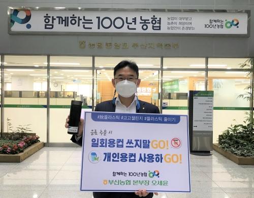 부산농협 오세윤 본부장은 최근 사회적 공감대 형성을 위해 환경부가 시작한 탈(脫)플라스틱 확산 운동인 ‘고고챌린지’ 릴레이 캠페인에 동참했다.