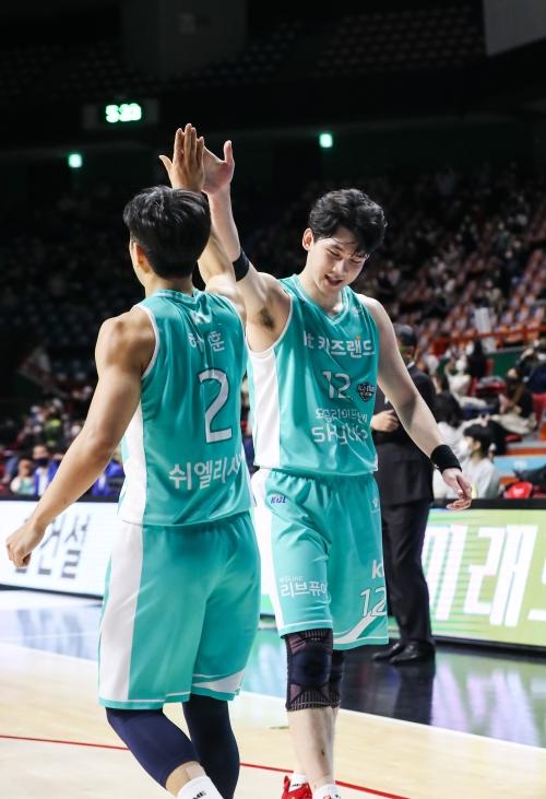 KT 소닉붐 박지원(오른쪽)과 허훈이 27일 부산 사직체육관에서 열린 프로농구 DB와의 경기에서 하이파이브를 하고 있다. KBL제공프로농구 부산 KT 소닉붐이 4연패 사슬을 끊고 6강 플레이오프 불씨를 되살렸다. 특히 프로 무대 적응에 고전하던 루키 박지원이 살아나며 승리에 힘을 보탰다.