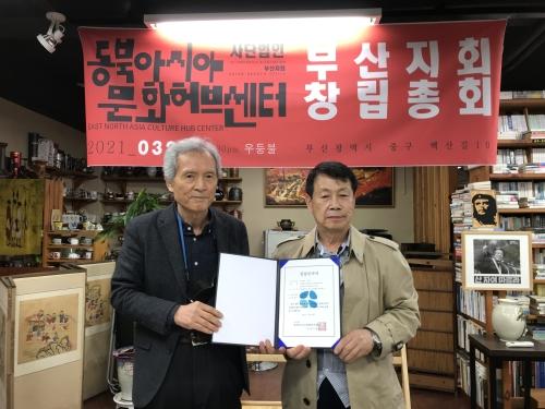 김흥우(오른쪽) 동북아시아문화허브센터 이사장과 김대원 부산지회장. 동북아문화허브센터 부산지회 제공동북아시아문화허브센터 부산지회가 발족했다.