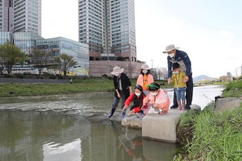 경남 창원시가 28일 도심을 흐르는 하천인 창원천에서 ‘생물다양성 보전을 위한 시민생물조사단’ 발대식을 했다. 허성무 창원시장과 조사단원들이 창원천을 조사하고 있다. 창원시 제공