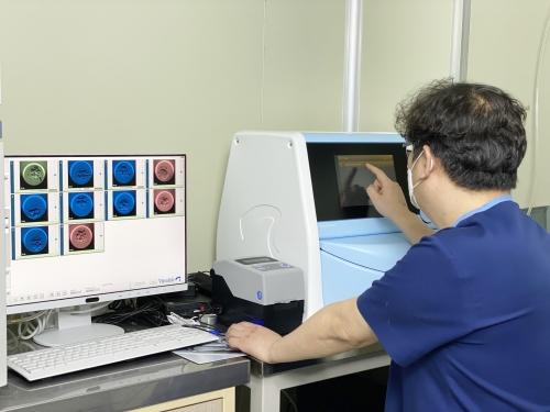 좋은문화병원 난임센터에서 의료진이 인공지능(AI) 타임랩스 시스템으로 배아 상태를 살펴보고 있다. 좋은문화병원 제공좋은문화병원(병원장 문화숙)이 영남지역에서 처음으로 인공지능(AI) 배아 배양시스템을 도입했다.