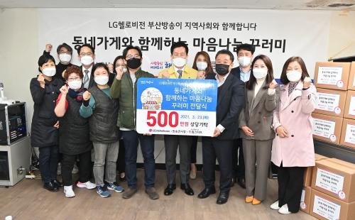 LG헬로비전은 최근 취약 계층 지원과 지역경제 활성화를 위해 부산 해운대구청, 반송큰시장상인회와 ‘동네 가게와 함께하는 마음 나눔 꾸러미 사업’을 펼쳤다.
