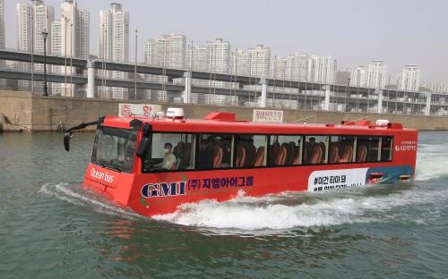 29일 오전 국내 기술로 제작된 수륙양용버스가 부산 수영만 앞바다에서 시험 운행을 하고 있다. 부산시는 올해 6월 부산 관광의 새 명물이 될 해상시티투어 민간 사업자를 선정한 후 올 11월부터 수륙양용버스를 운행할 계획이다. 김경현 기자 view@