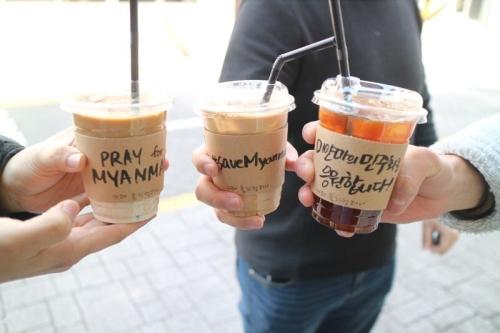 부산 북구 카페 ‘홍지컴퍼니’는 미얀마 시민을 응원하는 문구를 컵홀더에 새기고 있다.